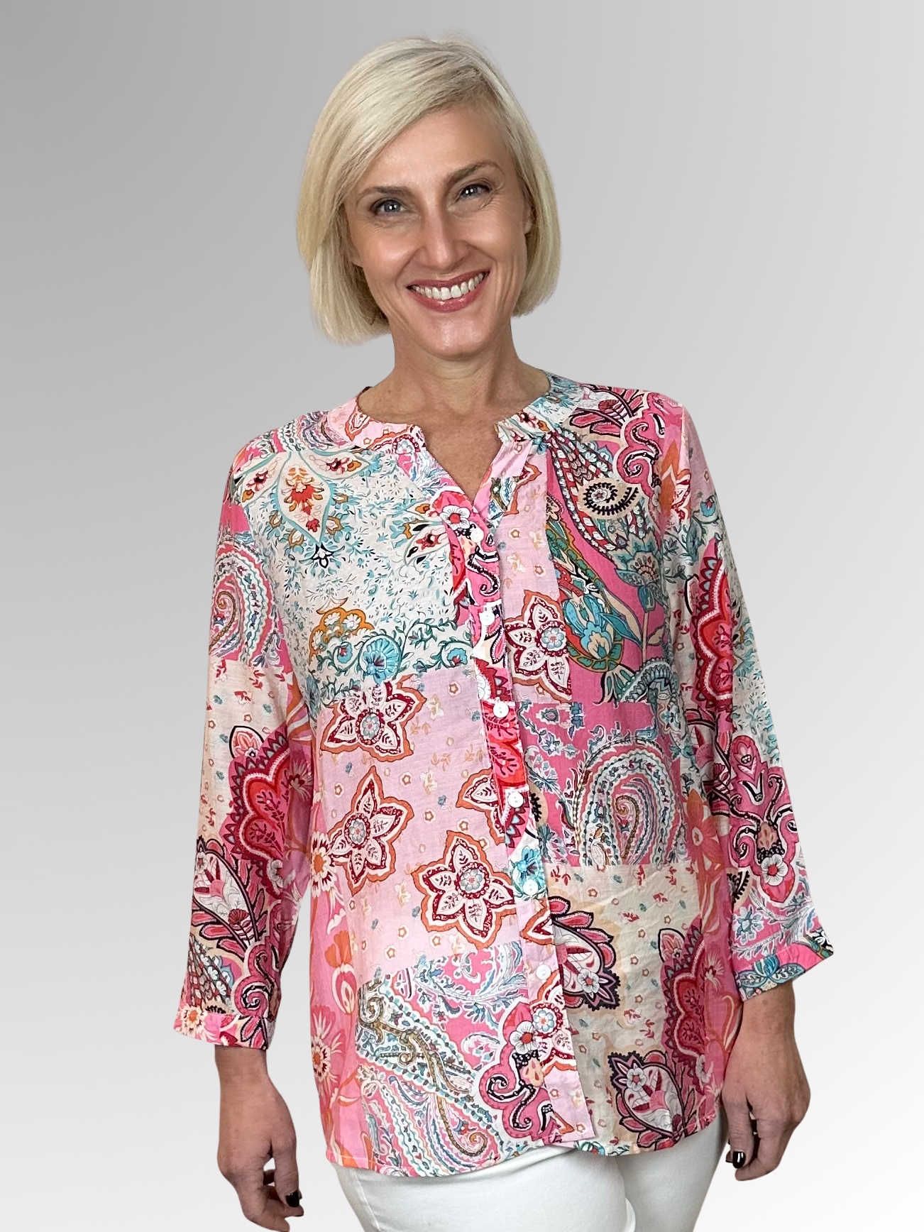 Get ready for summer with Renoma's Patch 3/4 Sleeve Blouse. This breezy blouse boasts a delicate, feminine print that's effortless to match. With a fashionable cut away round neck and 3/4 sleeves, you'll stay chic and comfy all day long. Crafted from a blend of viscose and nylon, this top is a must-have!