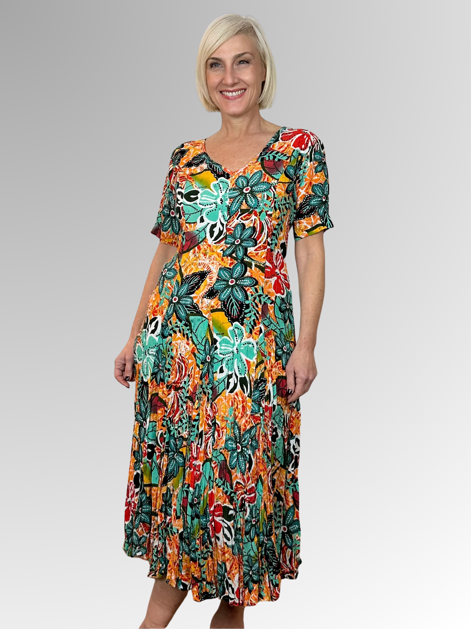 Introducing the Guaratiba Godet Dress by Orientique! Made from soft, sustainable rayon, this dress features a hand painted tropical print in orange, teals and black. The crinkle fabric is oh-so-comfy with no ironing required. Featuring short sleeves, a flattering V-neckline and godet panels through the skirt that create a beautiful drape and swing. Perfect for summer, this cool and flowy dress is a must-have addition to your wardrobe.
