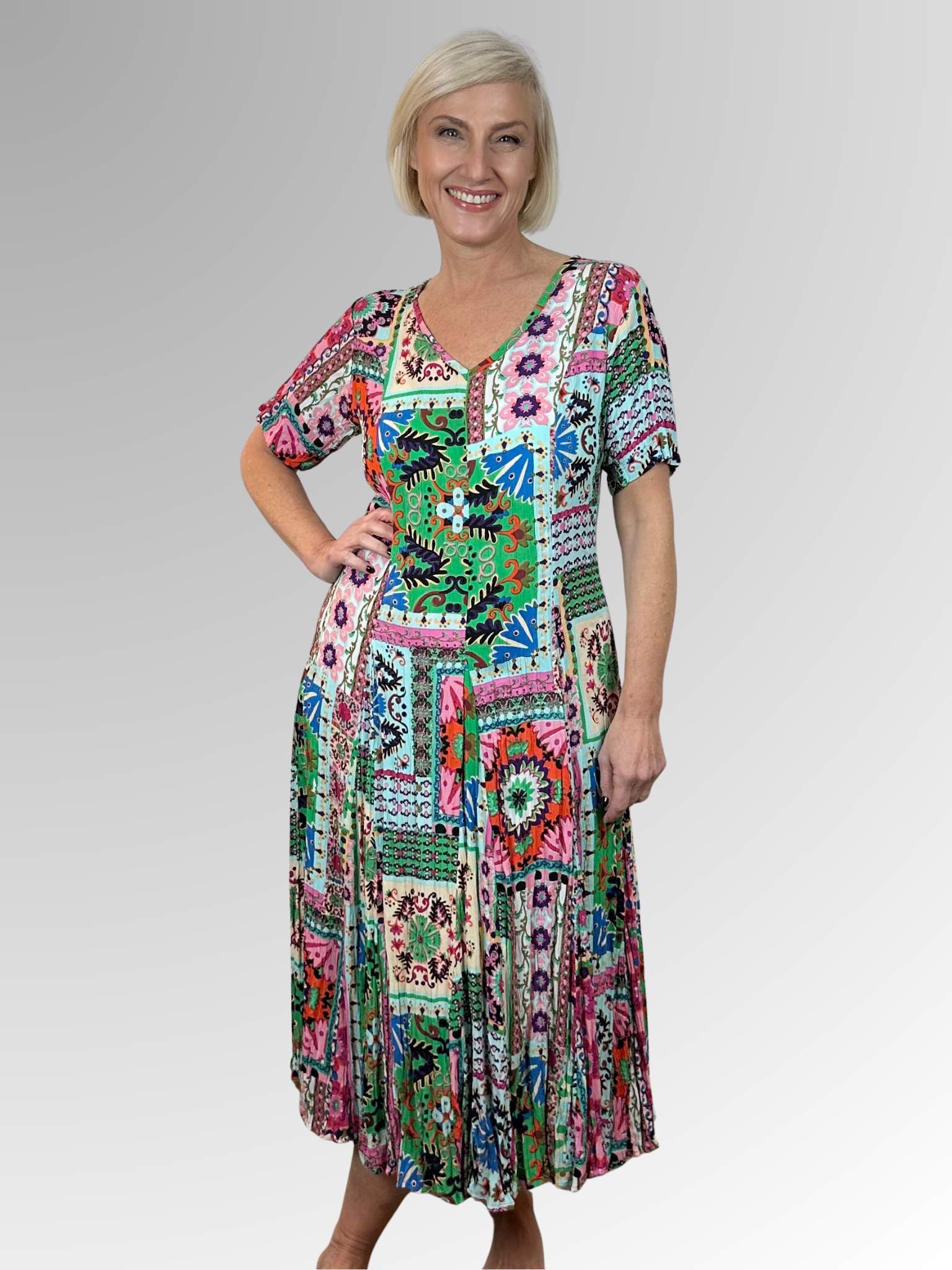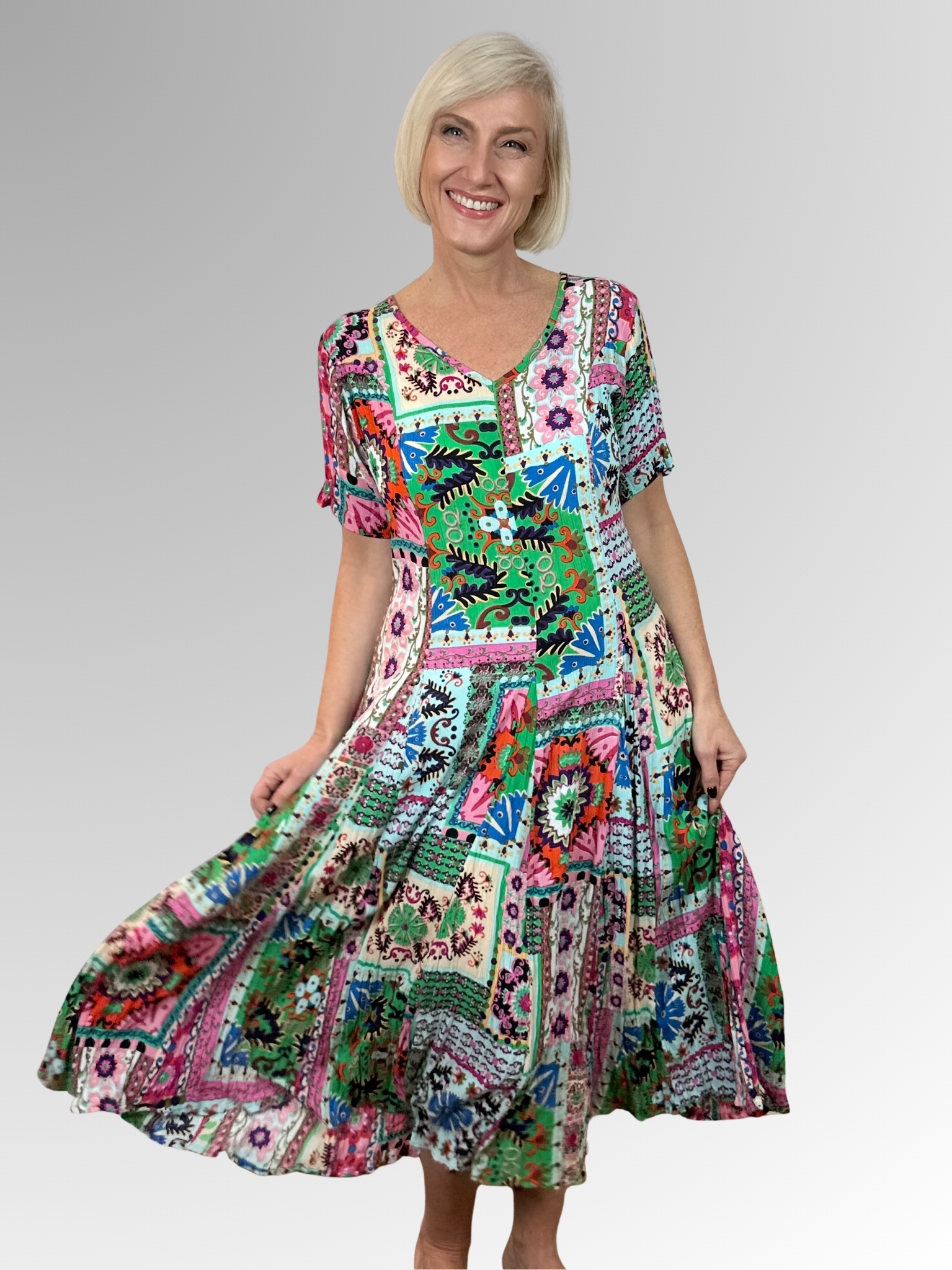 Introducing the Sao Bento Godet Dress by Orientique! Made from soft, sustainable rayon, this dress features a hand painted patchwork print in a gorgeous array of colours. The crinkle fabric is oh-so-comfy with no ironing required. Featuring short sleeves, a flattering V-neckline and godet panels through the skirt that create a beautiful drape and swing. Perfect for summer, this cool and flowy dress is a must-have addition to your wardrobe.
