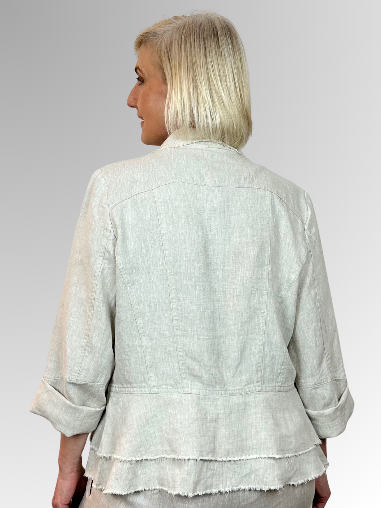 The Natural Peplum Jacket by Maglia is your perfect summer companion. Made from breathable linen, it features a stylish waterfall collar and a layered peplum for shape. With charming raw edging and fold-back 3/4-length sleeves, this versatile piece transitions effortlessly from workdays to weekend adventures. Light, playful, and effortlessly chic!