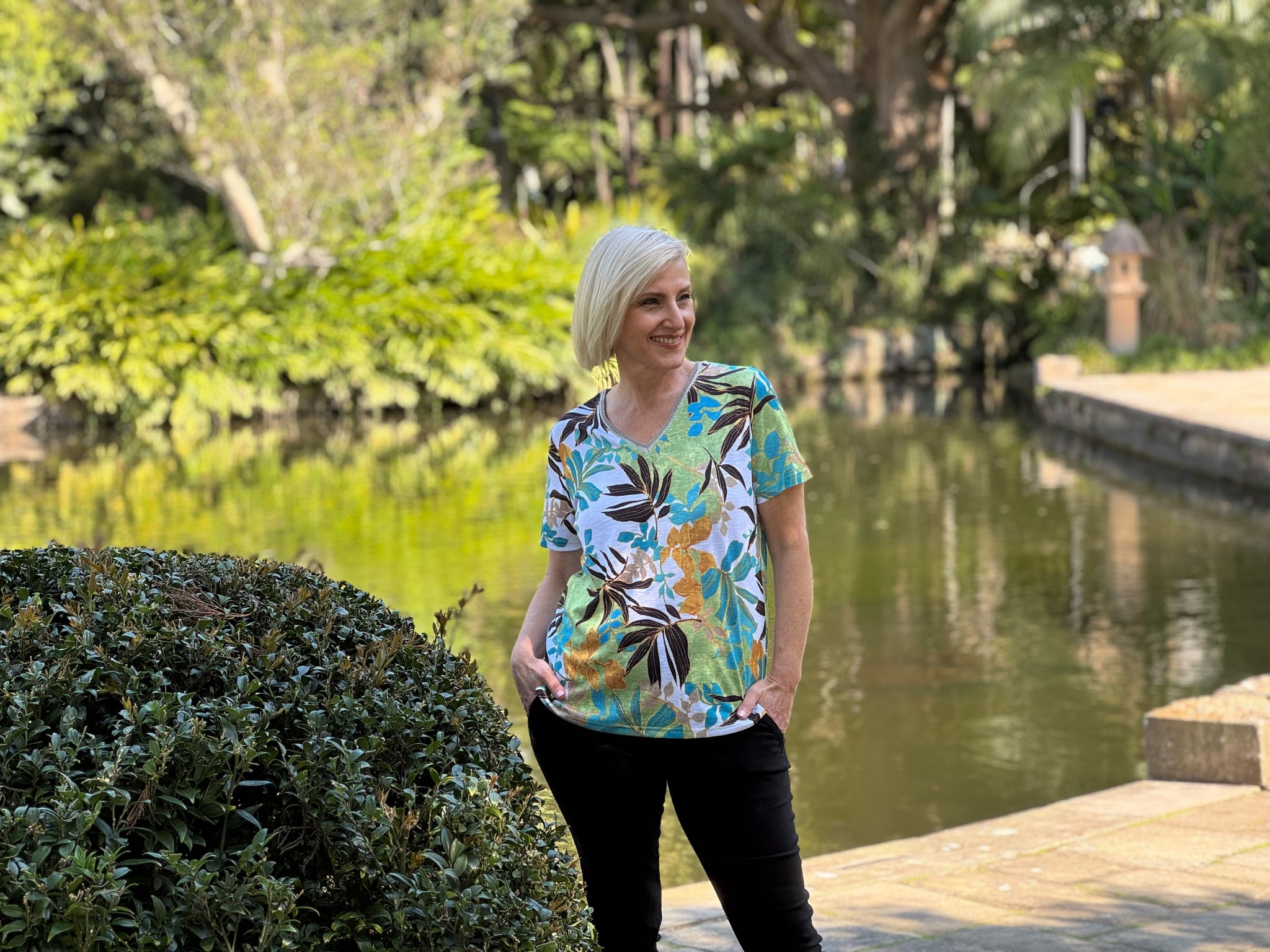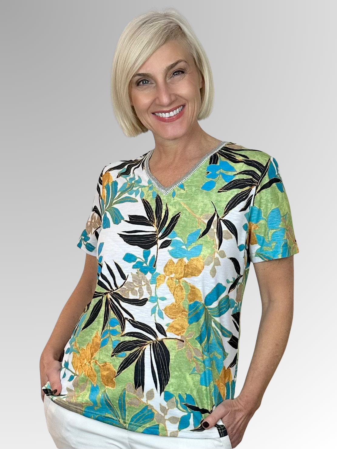 Embrace sunny days in the Aegean Tee by Jillian, featuring a vibrant tropical print that brings fun to your wardrobe. The relaxed fit and flattering V-neck offer effortless style, while the soft polyester-elastane blend ensures comfort all day long. Perfect for a carefree, summery vibe that turns heads wherever you go.