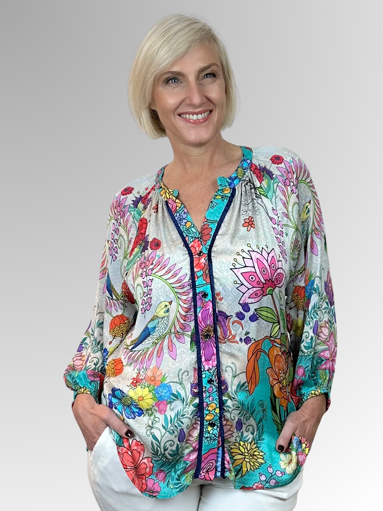 The Lesante 3/4 Sleeve Overshirt by Lula Soul offers a pretty and feminine style with its flouncy silhouette and delicate floral print featuring birds. Crafted from silky viscose, it feels smooth against the skin and is perfect worn open over a coordinating camisole for a playful, breezy look.