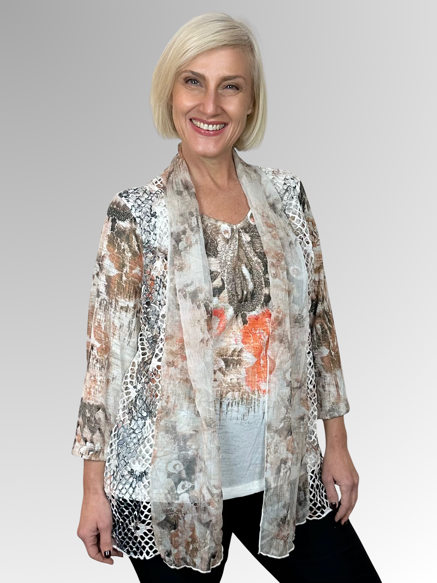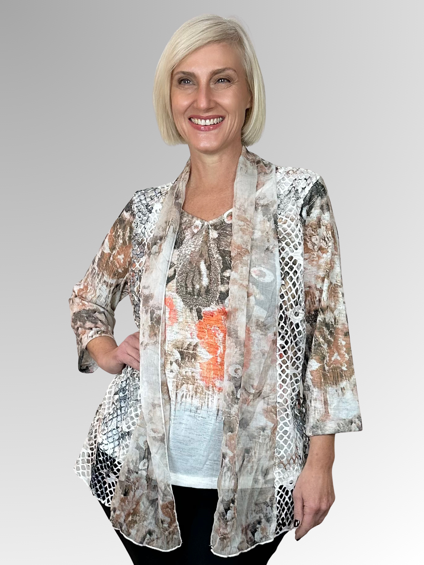 Our fashionable Breezy Twofer Top offers a stylish summer look. Crafted to flatter the figure while seamlessly concealing tummies and hips, this piece features a sewn-in camisole and free-flowing jacket. Featuring a feminine print in earthy tones, it's made of polyester, chiffon and mesh for added sophistication. Easily washable and drip-drying, this top requires no ironing.