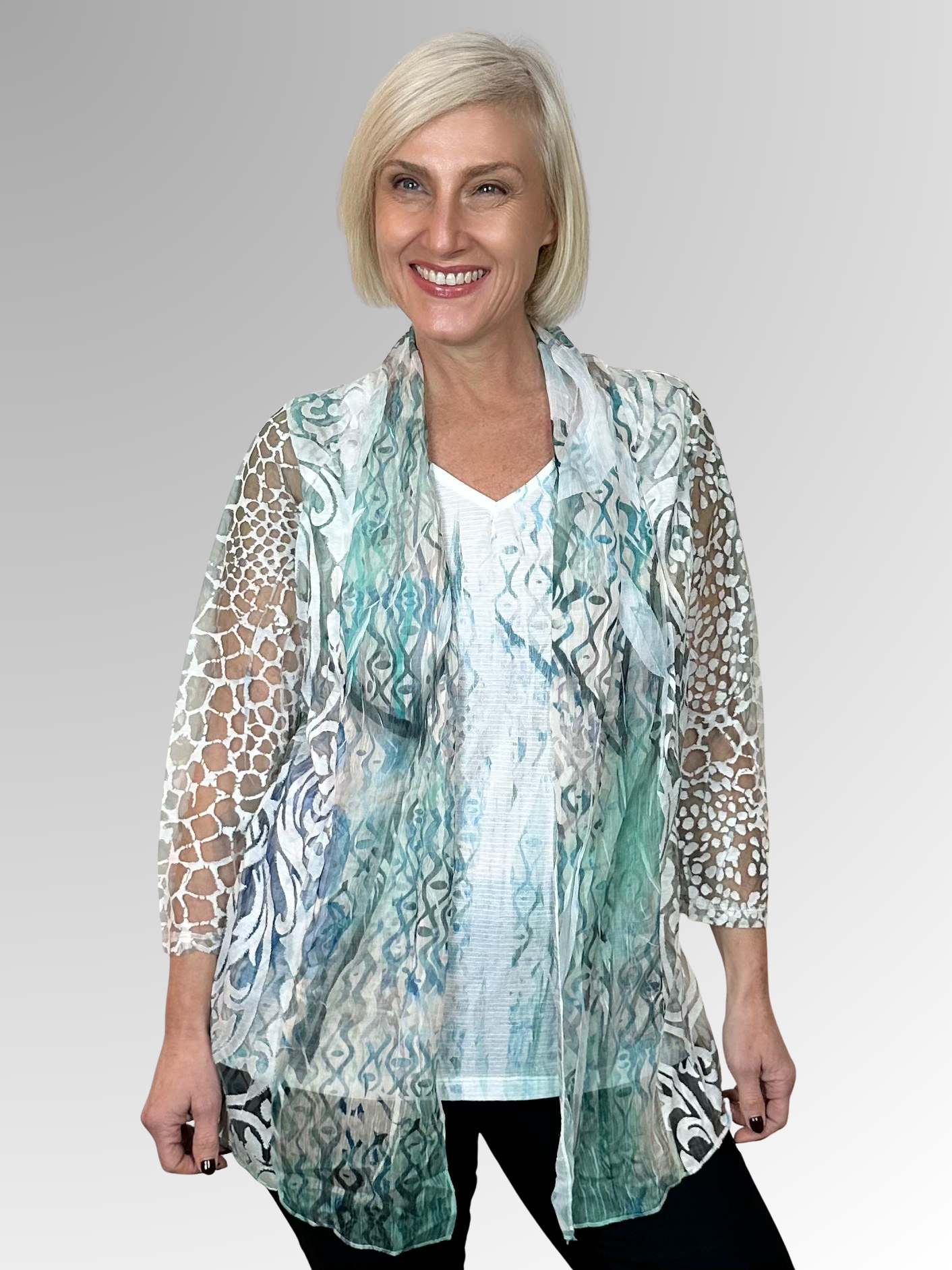 Our fashionable Wispy Twofer Top offers a stylish summer look. Crafted to flatter the figure while seamlessly concealing tummies and hips, this piece features a sewn-in camisole and free-flowing jacket. Featuring a feminine print in soft blue and pewter tones, it's made of polyester, chiffon and mesh for added sophistication. Easily washable and drip-drying, this top requires no ironing.